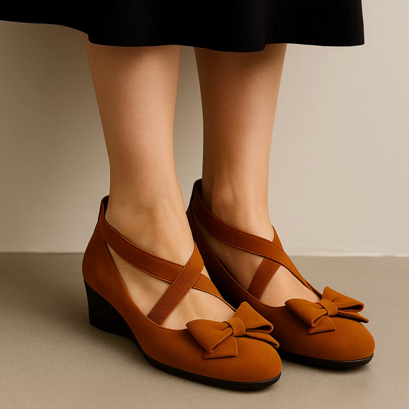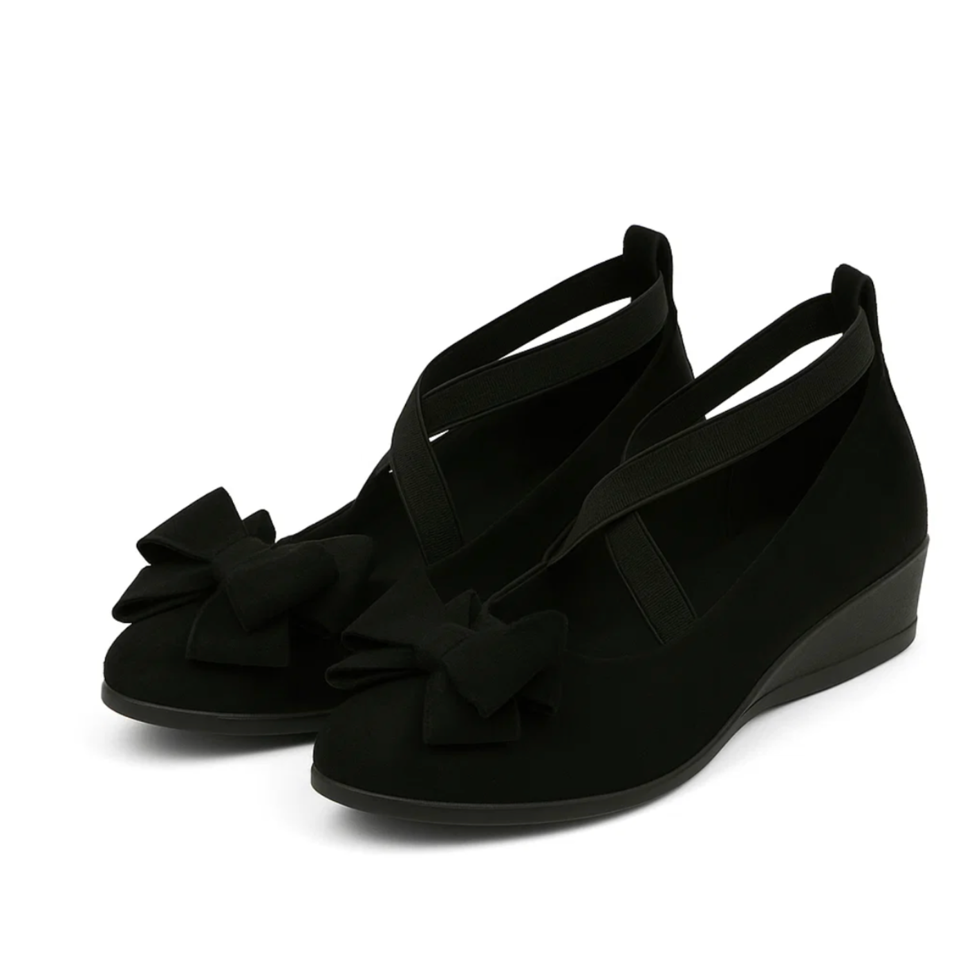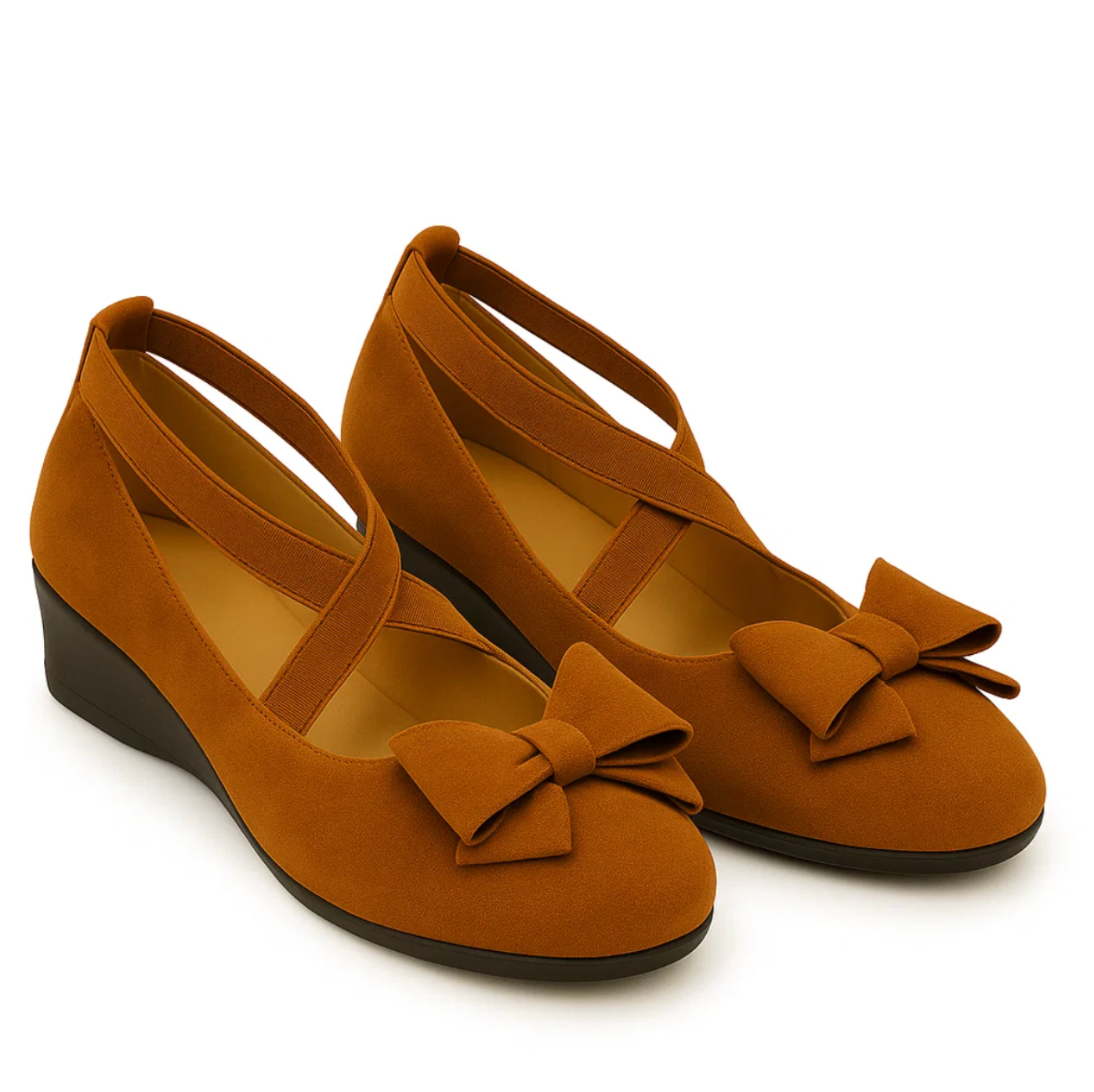 These are the Elodie Ballerinas — a refined mix of elegance, comfort, and feminine charm. These stylish slip-ons with a subtle wedge heel and soft suede-look fabric are designed for women who want to feel effortlessly confident. The crossed elastic straps provide extra support and ensure a perfect fit, while the decorative bow at the front adds a touch of playfulness. Perfect for everyday wear, work, or a stylish evening stroll.