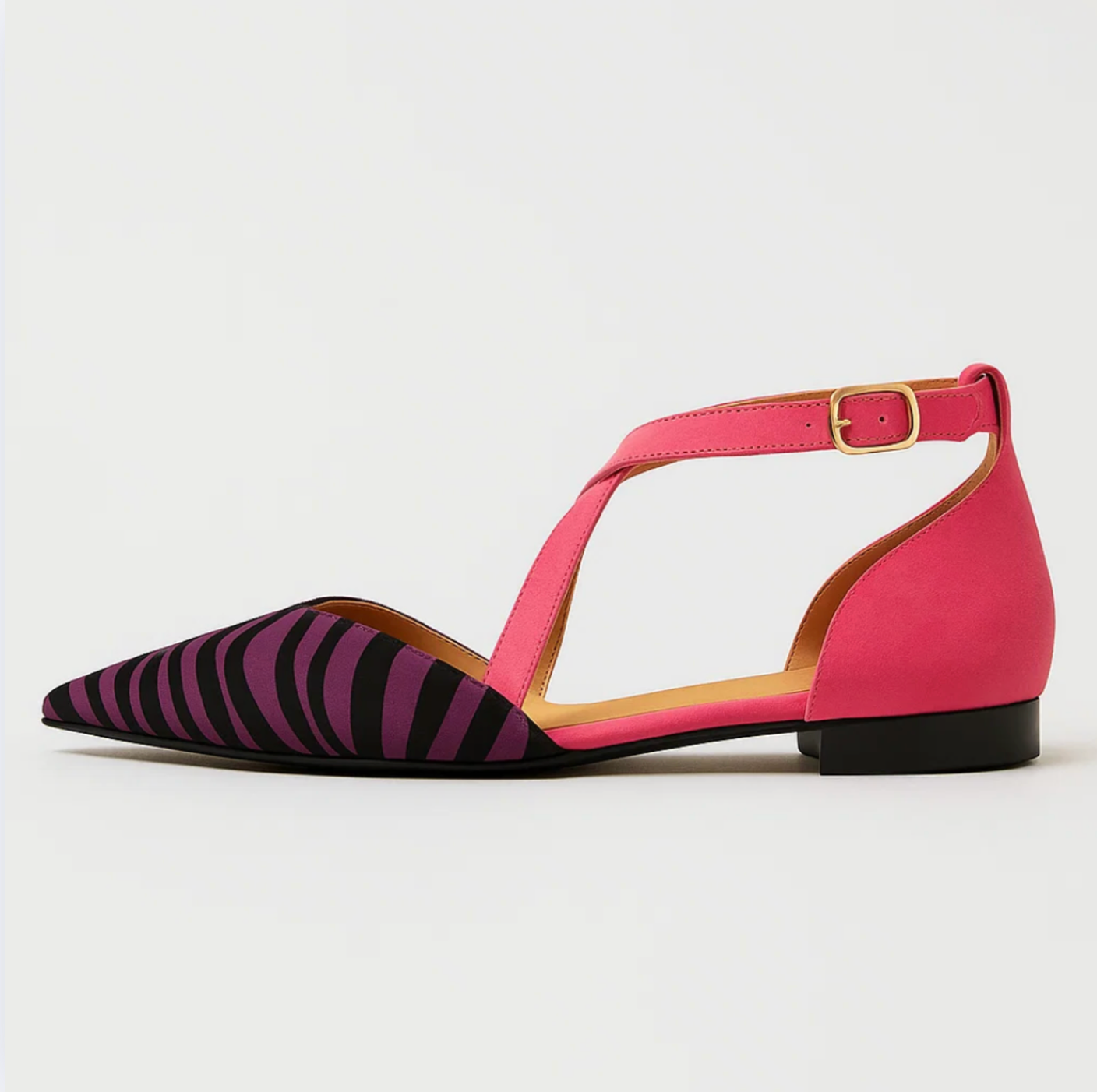 Let your outfit do the talking with the Zebra Chic Ballerina. These striking flats combine a bold zebra print with vibrant fuchsia suede straps that elegantly cross over the foot. The design is playful yet refined, perfect for women who love to make a statement with their style without compromising on comfort. The pointed toe and low heel give the shoe a feminine touch, ideal for both casual and semi-formal occasions.